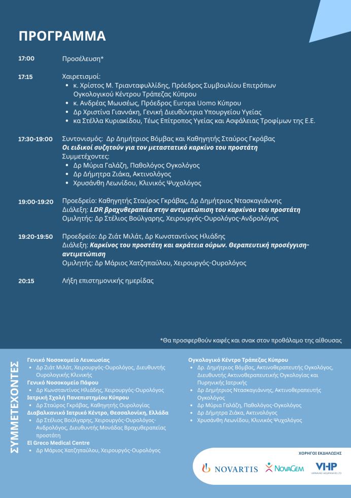 The seminar is under the auspices of the Ministry of Health and is supported by the Cyprus Oncology Society and the Cypriot Urology Society. Sponsors, Novartis, Novagem and VHP companies. For a statement of participation, the public may communicate to tel. 99 802871 up to Tuesday 25/3.