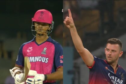 Yashasvi Jaiswal and Josh Hazlewood during the RCB vs RR IPL 2025…
