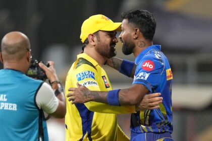 MS Dhoni (left) and Hardik Pandya after CSK vs MI, IPL 2025…