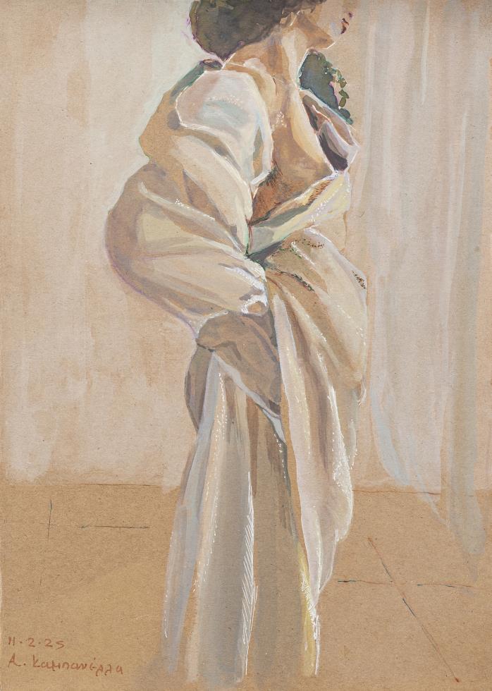 Young girls of today: The figures are found in a non -defined area. They are ready to cross the threshold of adulthood, leaving behind the girl … Some of them are wrapped in a simple piece of fabric, which, as an invented allegory, symbolizes the roles that appear on the road that opens in front of them, through the social condition, in whatever.