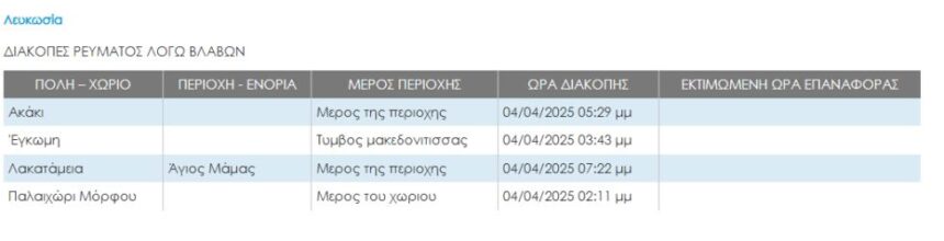 Problems continue on the EAC network, with several areas without electricity, with the problem not resolved in Akaki, Egomi and Paleochori Morphou in the Nicosia province, and Lakatameia has also been added, according to the EAC website.