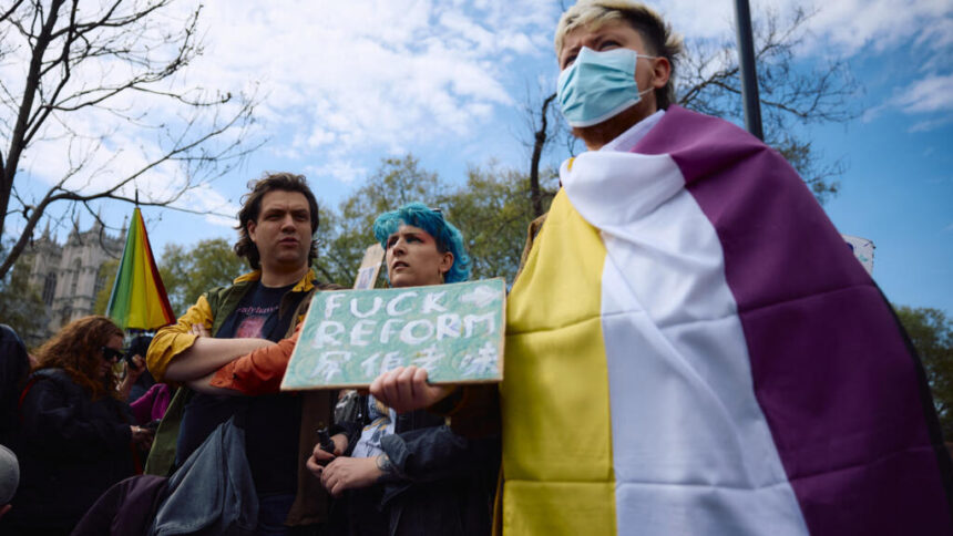 Thousands of London trans rights protesters gathered in Parliament Square on Saturday, days after the UK Supreme Court ruled that a woman is someone born biologically female and that transgender women are excluded from that legal definition.